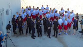A classic photo opp below captures Just graduated ROOKIE, Shane Brouwer, with Section Chief, Erik Albertson... meanwhile in the background... OL Vince Fiamengo tries to slip out of range with his second donut...